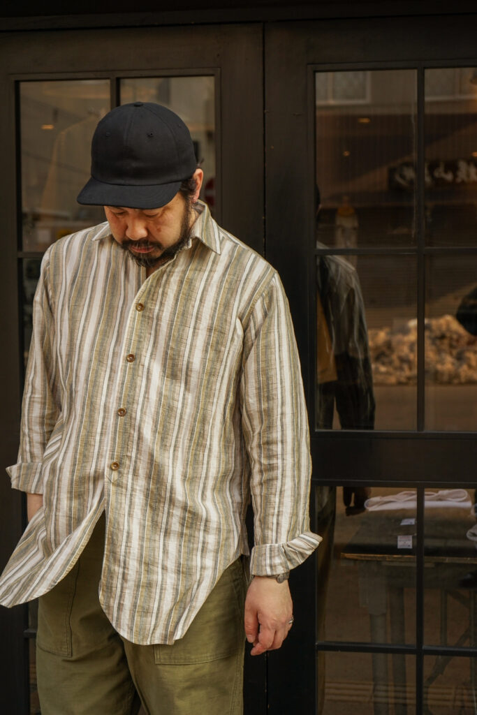 リネン×コットン素材なので今時期はカットソーの上から着たり、夏に向けては袖を捲り、一枚でバサっと羽織るのも良いかと、肌当たりの良いしっとりと柔らかい質感で着心地も抜群です。写真で僕が着用しているのは数回洗い着込んでいる物、生地特有のクタッとした質感になり、”生地の落ち感”も非常に良いです。