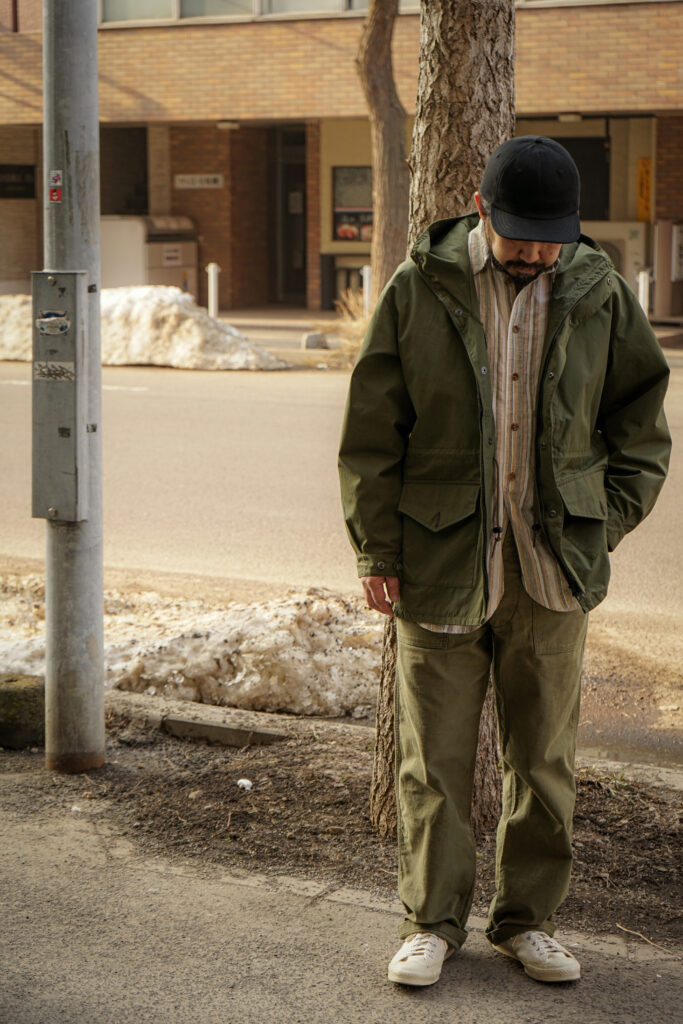 所謂ストライプシャツですが、イメージしている小綺麗なストライプ柄というよりは、良い意味野暮ったさのある男臭い風合いの柄が良く、自分が日々愛用している軍パンやチノパン、そして5ポケットジーンズとの相性が抜群に良く、