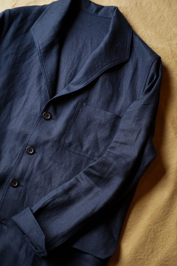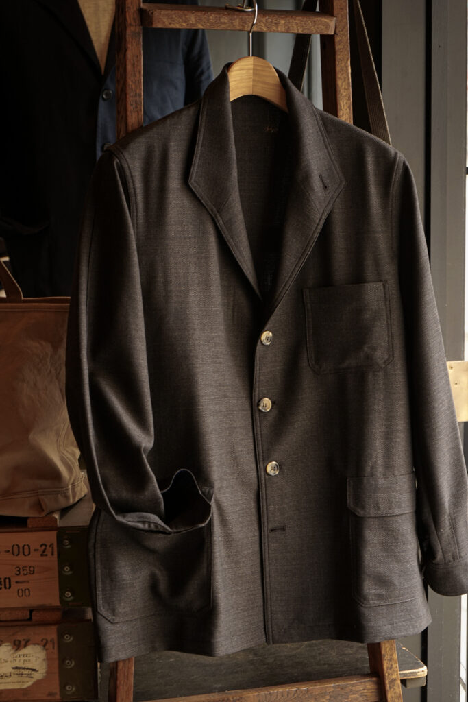 テーラードジャケットのようでありながら、カバーオールの要素も併せ持ち、さらにハンティングジャケットのニュアンスも感じさせる。