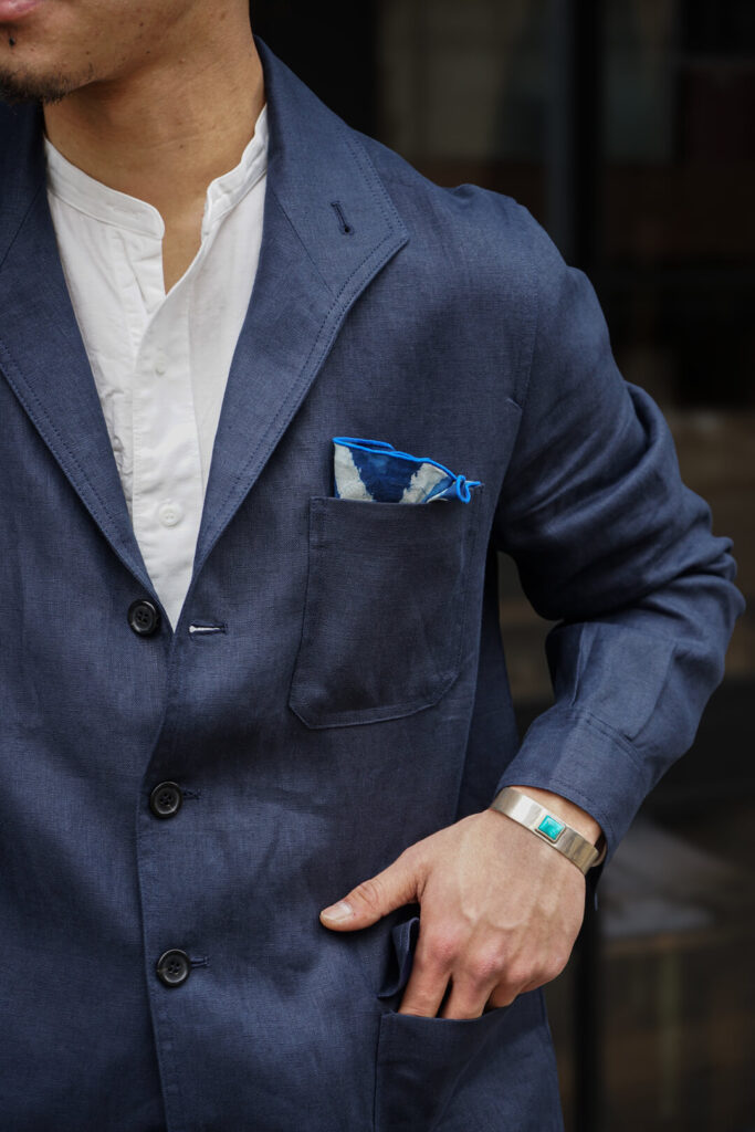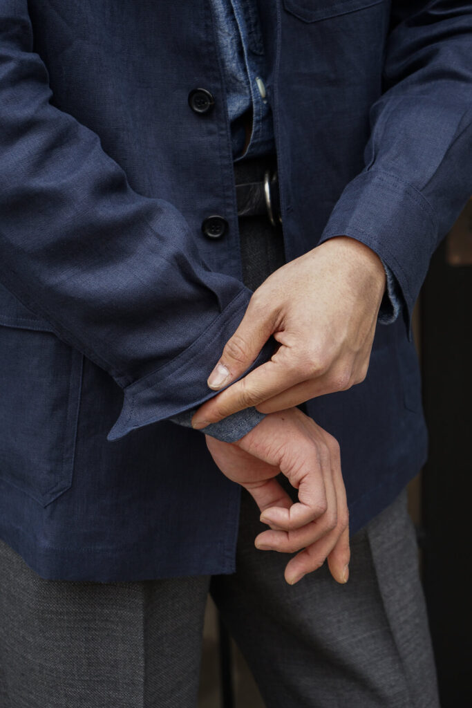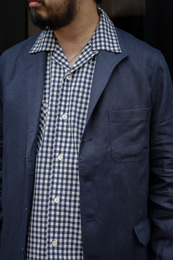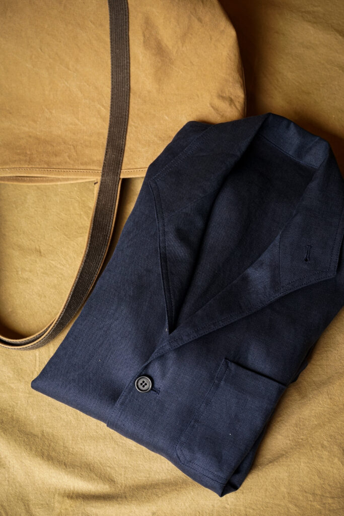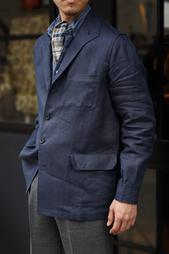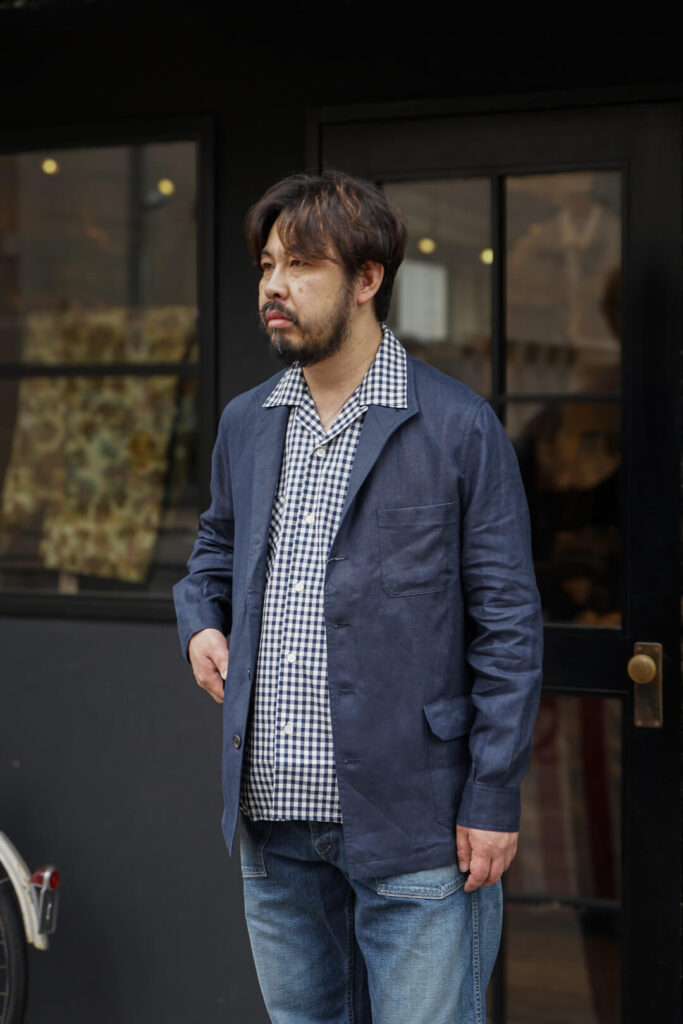 今回オーダーした生地は、ウールホップサック生地とリネン生地。裏地を省いた軽やかな仕立てなので、春夏にも快適な着心地。シャツはもちろん、カットソーとの組み合わせも自然に馴染みます。