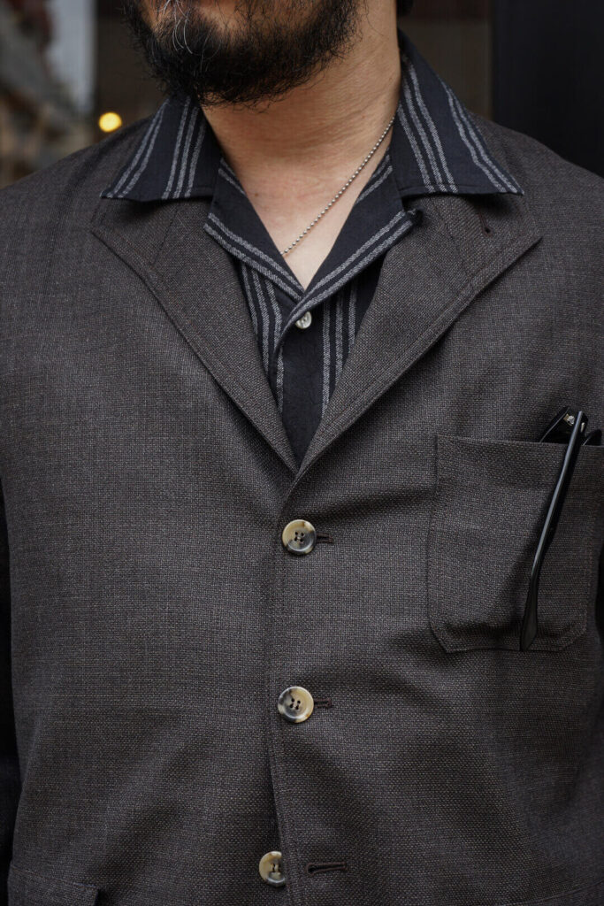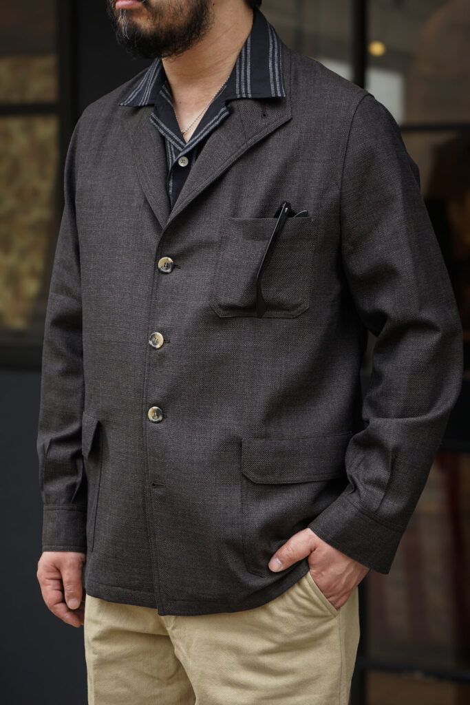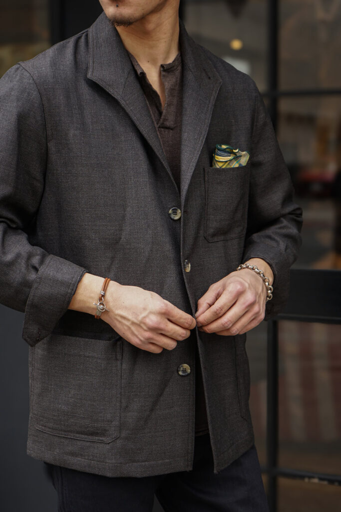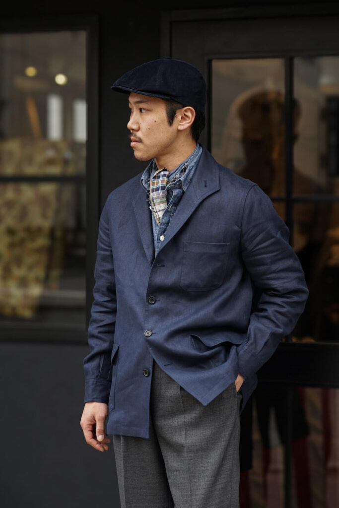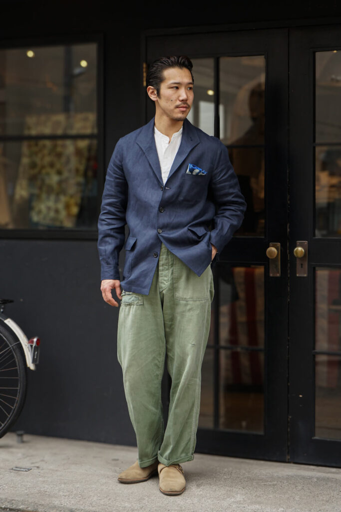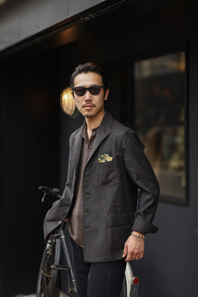 本国での着こなしやスナップを見ると、テーラードのように羽織りつつ、どこか力の抜けたバランス。ドレスを少しカジュアルに崩す、そんな使い方も魅力的ですし、ハンティングジャケットや、カバーオール解釈でコーディネートしても良いでしょう。ヨネカジスタイルにも自然と馴染むTEBA JACKET。