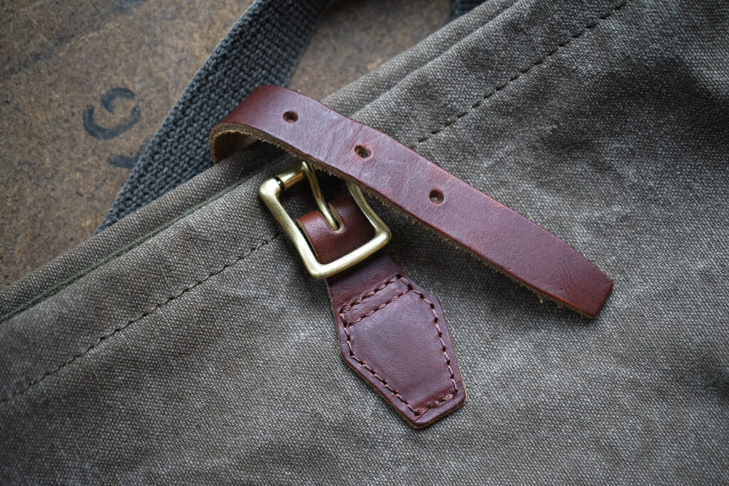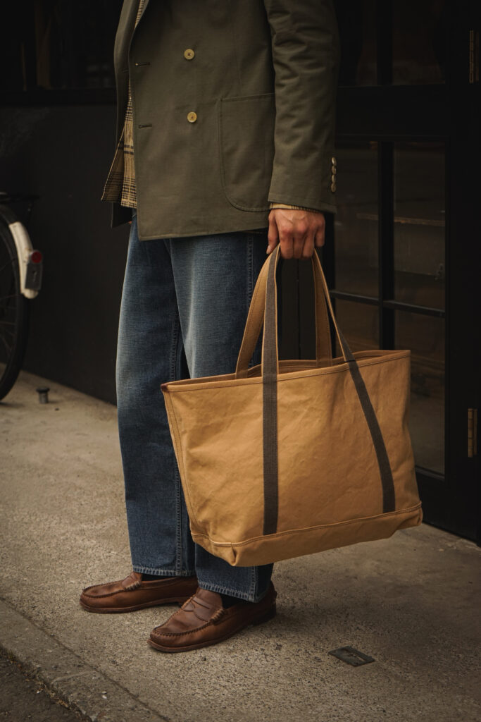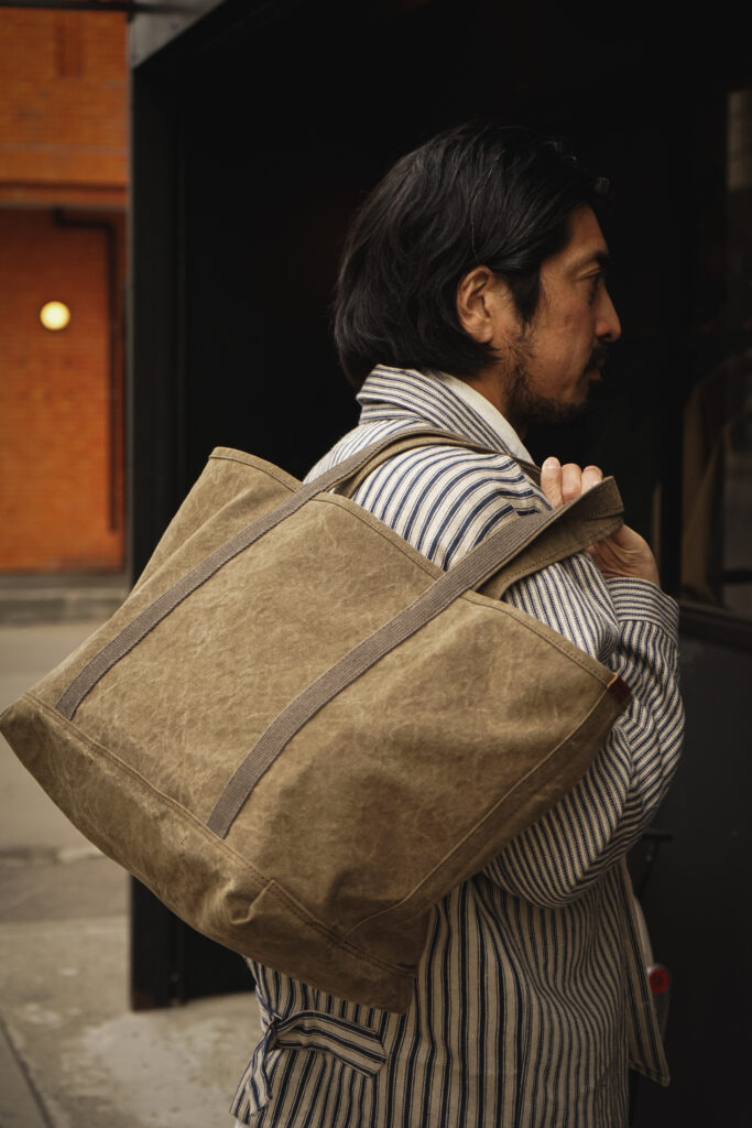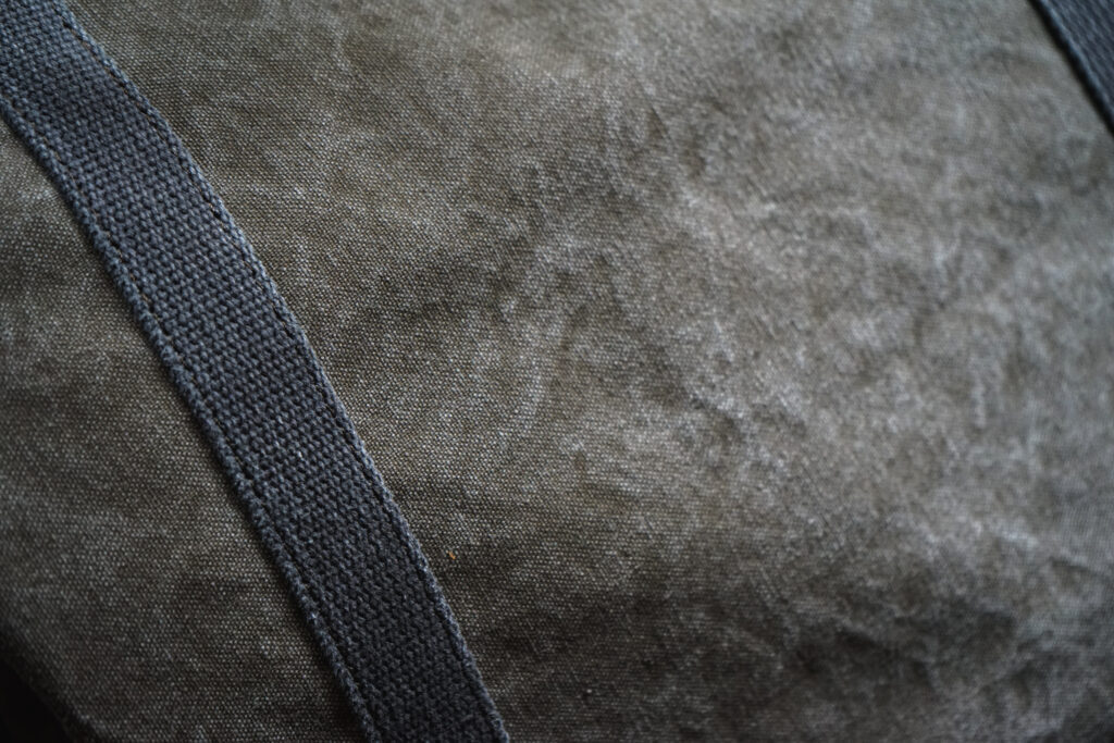 先ずは素材使い。本体の生地は力織機と言われる昔ながらの織機を使い岡山倉敷で織られた耳付の9号”帆布”(はんぷ)をベースに、植物から抽出されるベジタブルタンニンで染めた天然草木染めの素材です。