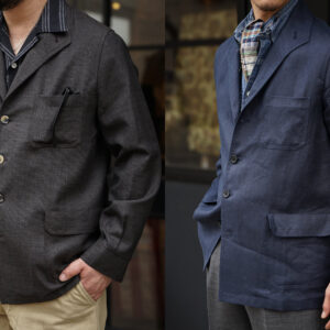 同ブランドでは定番的な形の一つであるカーディガンタイプ。サイドにはポケットが付いており、これからの季節に重宝する一枚です。無駄を削ぎ落とした非常にシンプルなデザインですが、素材が持つ雰囲気で存在感抜群の仕上がりになっています。肉厚でしっとりとしたヴィンテージリネンの素材は着込み洗いを繰り返し育て甲斐のある一枚です。リネン特有のザラッとした質感が無く、Tシャツなんかに軽く羽織っても肌当たりが非常に良く着心地が良いのも今回の生地の特徴の一つでもあります。品のある素材感はトラウザーズに合わせて少し上品に着て頂きたいアイテム。
